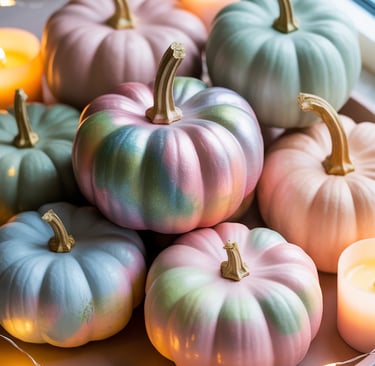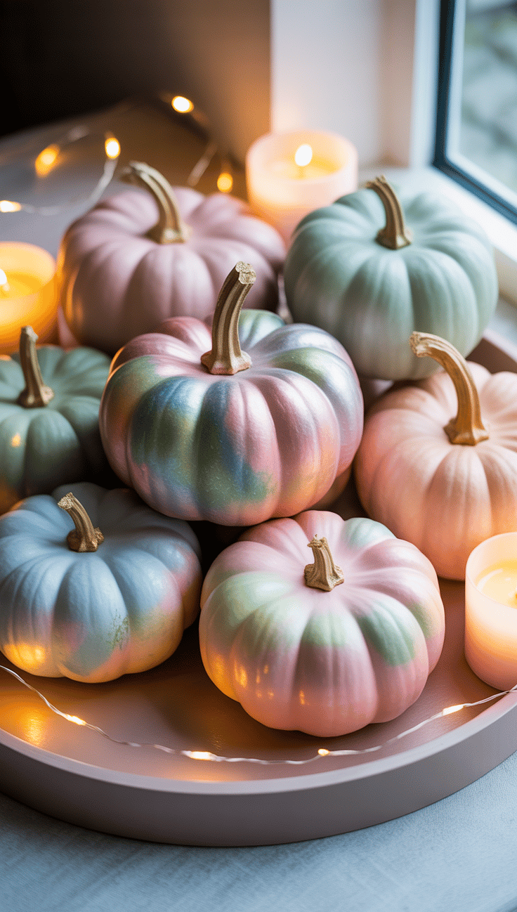 Start by choosing smooth foam pumpkins or small white faux ones as your base. Use a watercolor acrylic paint set and a damp sponge or wide soft brush to lightly blend colors while they’re still wet — let them merge naturally for that dreamy, watercolor fade. Once dry, finish with a pearlescent glaze or shimmer top coat to catch the light just right. Group them together on a neutral tray, surrounded by candles or fairy lights, for a soft, romantic glow.