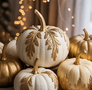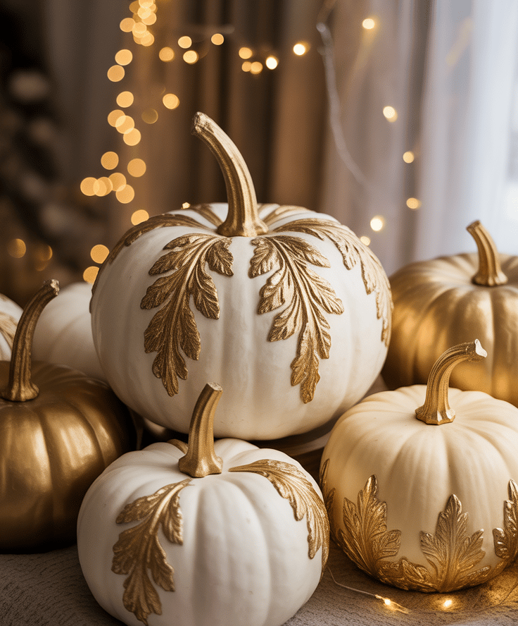 Transform ordinary pumpkins into elegant fall accents by using matte white and taupe tones accented with genuine gold leaf highlights—perfect for a modern, cozy home where simplicity speaks louder than a carved jack-o-lantern.