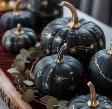 Start with small or medium pumpkins (real or faux) and paint them in matte black chalk paint for a soft, velvety finish. Once dry, use metallic paint pens to sketch delicate celestial designs — stars, constellations, or a crescent moon pattern swirling around the stem. You can even stencil small gold dots for a minimalist shimmer. Arrange your finished pumpkins on a wooden board or dark velvet runner, and weave in a few dried eucalyptus stems for contrast.