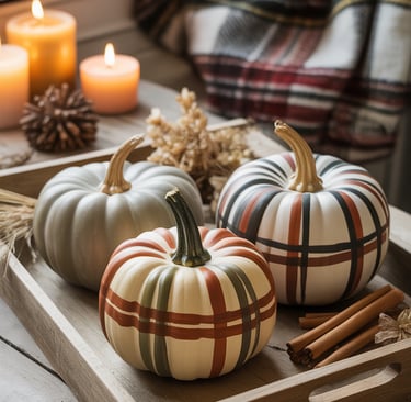 Bring the warmth of your favorite fall flannel to your tabletop with hand-painted plaid pumpkins. This design captures that fireside, hot-cocoa vibe and instantly ties your autumn decor together. Start by painting each pumpkin a soft neutral base — think cream, beige, or muted gray. Once dry, use painter’s tape to create clean lines and layer thin strokes of rust, olive, and charcoal across the surface. A fine brush and a steady hand will give your stripes that cozy, woven look.