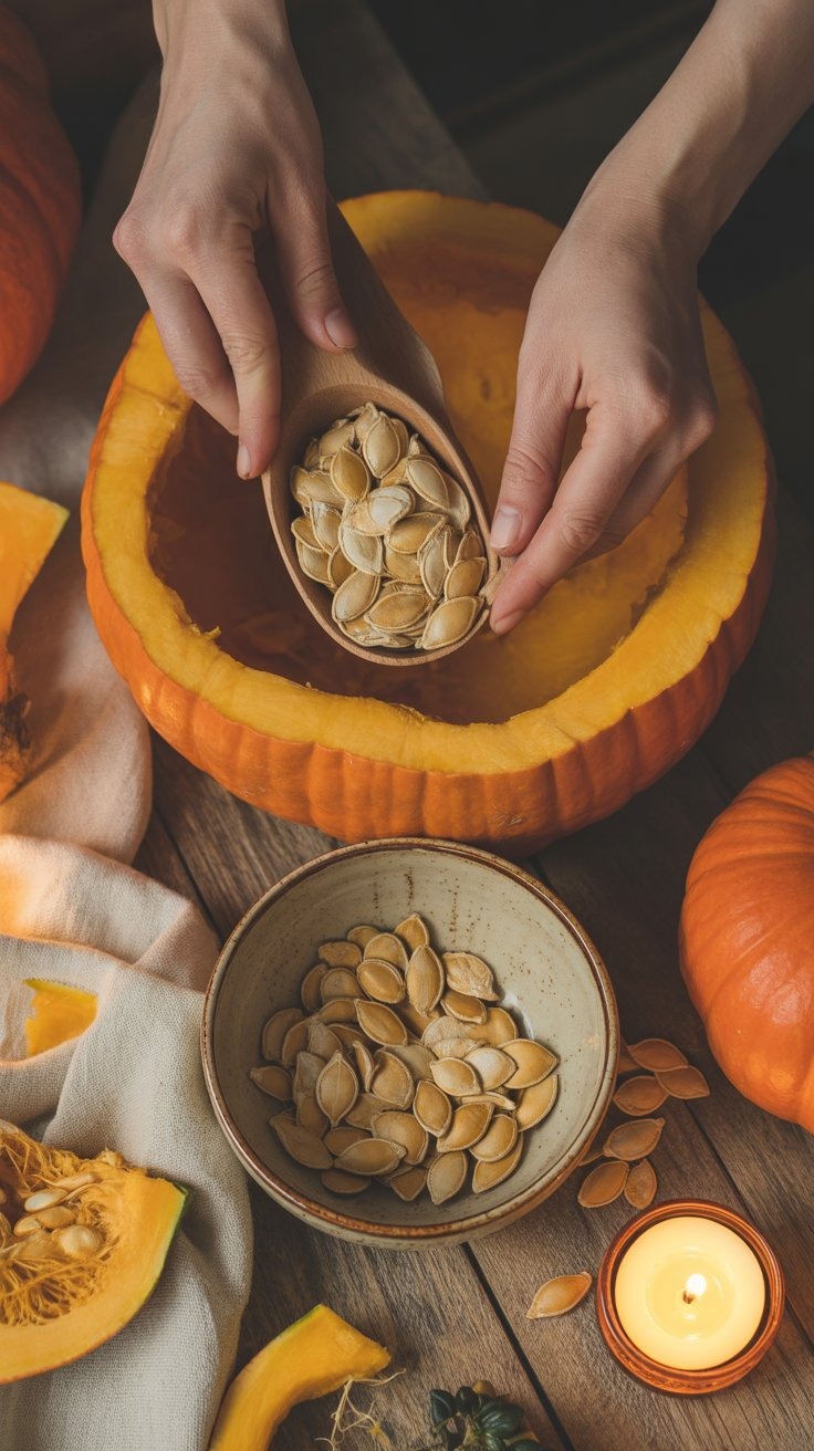 Cut a circular lid around the stem at an inward angle (so it doesn’t fall through later). Scoop out the seeds and stringy pulp — an ice cream scoop or metal spoon works perfectly. For extra longevity, rub the interior and edges with a bit of petroleum jelly or vegetable oil.