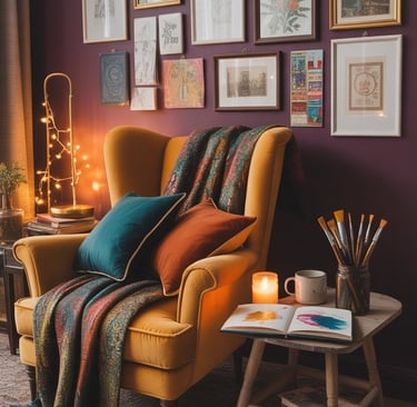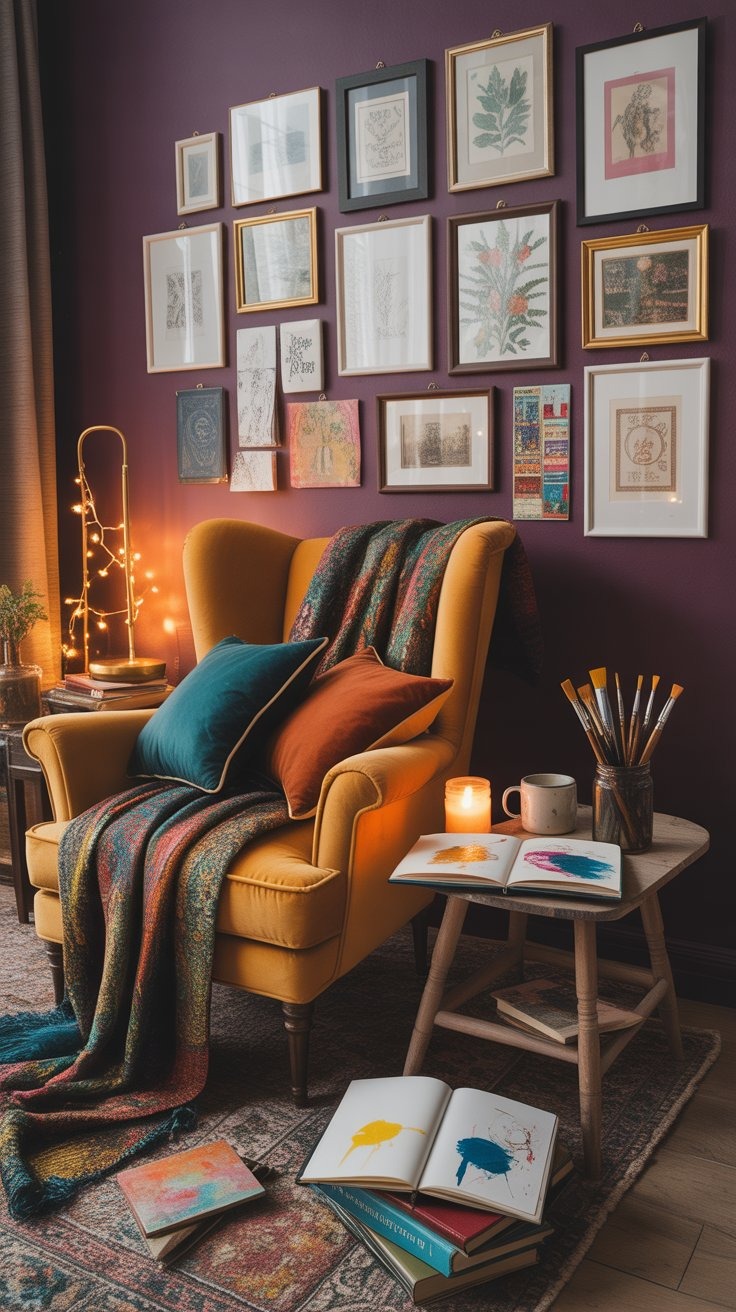 Start with a comfortable chair — plush, upholstered, or even vintage. Add a soft throw and a small side table stacked with notebooks, a cup of tea, or your favorite art book.