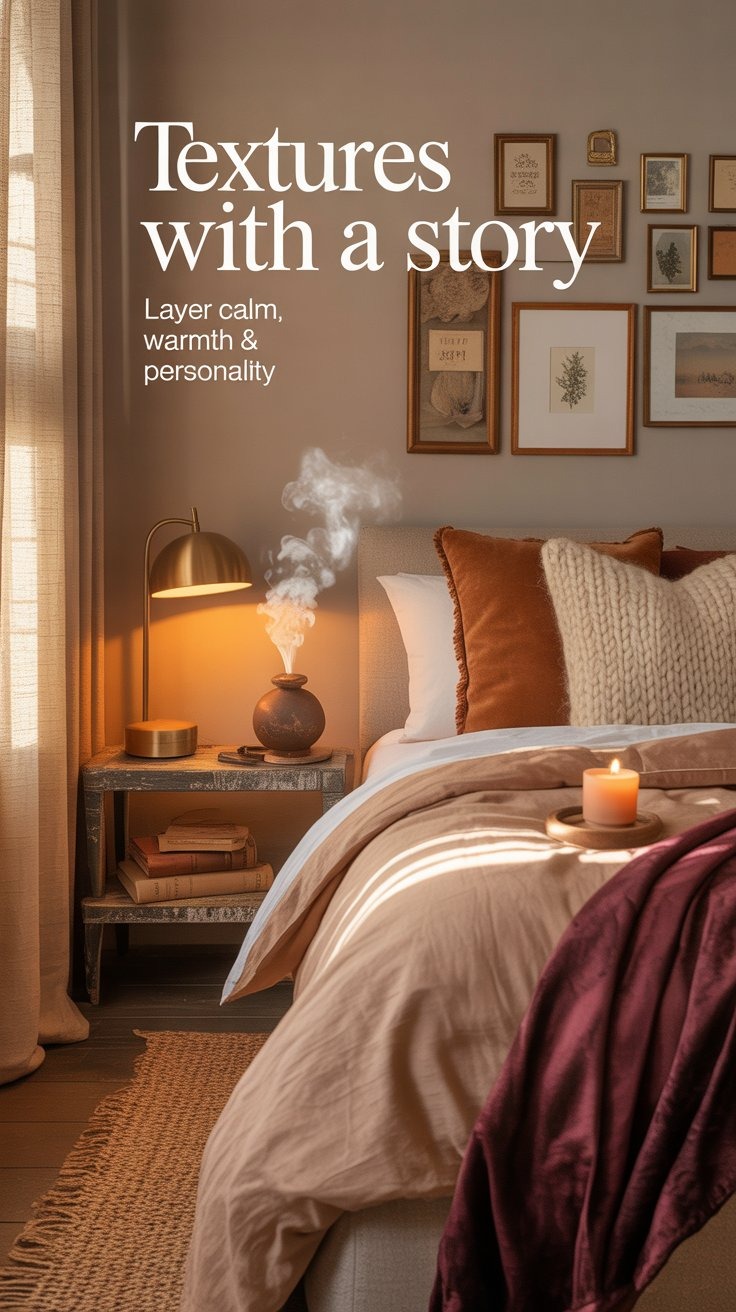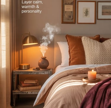 Start with bedding that feels lived in — a linen duvet, velvet throw, and a chunky knit blanket folded at the foot. Use muted tones (sand, sage, or blush) to build a soothing base, then layer one rich accent color like plum or ochre for mood.