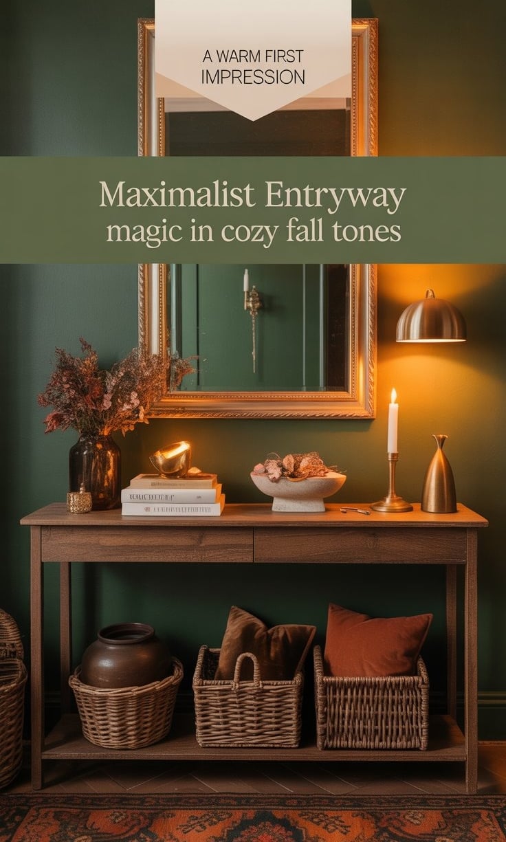 Roll out a vintage-style rug in warm fall tones like sienna, burnt orange, or deep green. A console table can hold a basket for keys, a small lamp for soft lighting, and a ceramic bowl for trinkets.