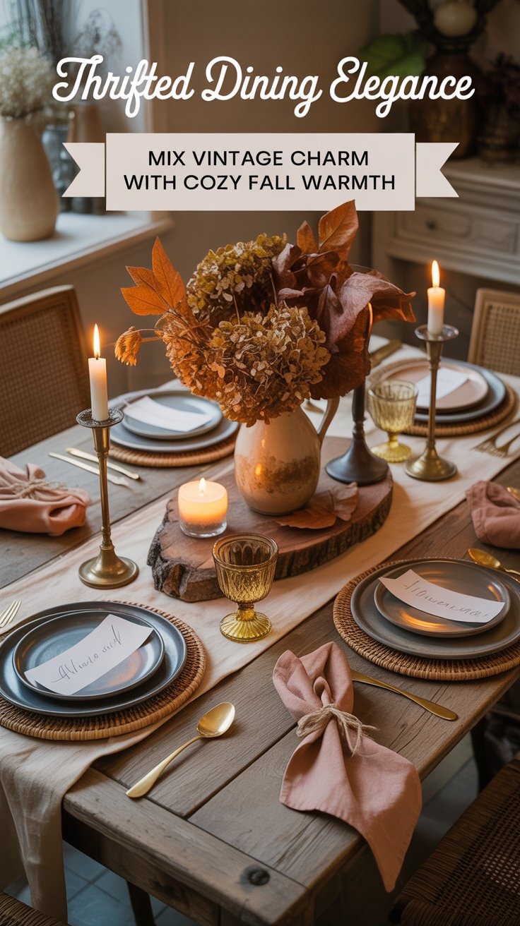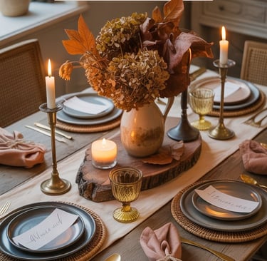 Start with the table: Layer a linen runner in oatmeal or rust tones. Stack mismatched ceramic plates and add vintage glassware for shimmer. A centerpiece of dried hydrangeas or fall leaves in a jug makes the space instantly seasonal.