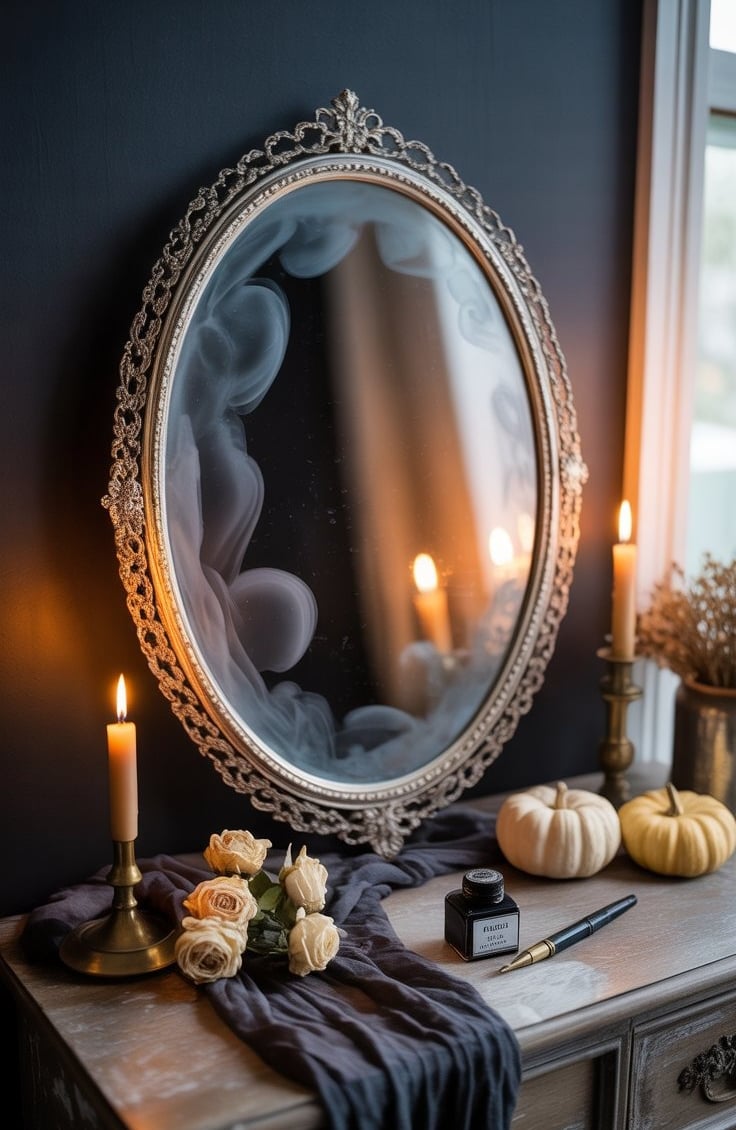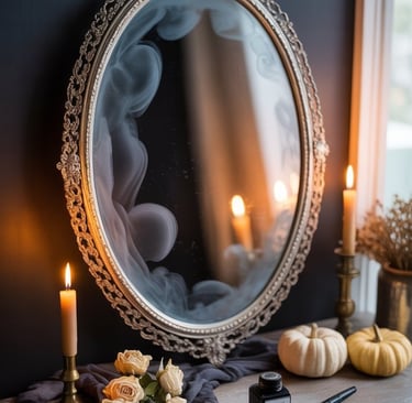 Hang your haunted mirror above a console table with flickering candles and dried flowers. The imperfect reflection catches and softens the light, creating that dreamy, cinematic glow — like stepping into a scene from a romantic ghost tale.