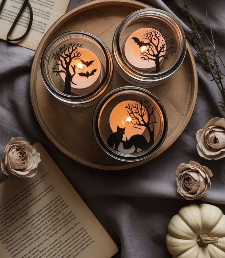 Cut delicate Halloween silhouettes from black cardstock — you can trace or freehand them. Tape or mount them inside glass jars or translucent paper lanterns. Place a battery-operated tea light or LED candle inside and watch as your cutouts cast gentle, moving shadows. For an extra cozy touch, add a thin layer of tracing paper over the jar for diffused light.
