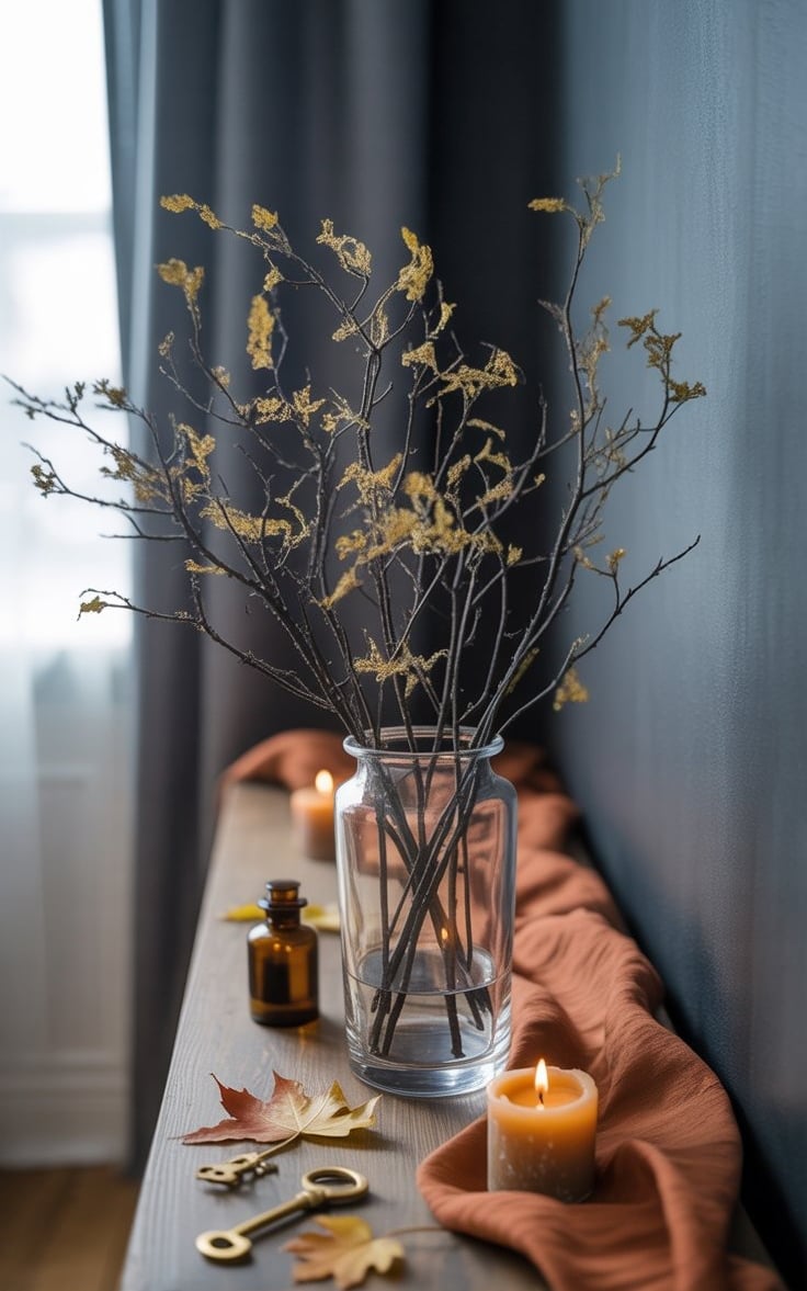 Add a few dried flowers or feathers for texture, or suspend tiny paper bats or stars from invisible thread. When placed near a window or candle, the branches cast intricate shadows that move gently with the air — pure autumn poetry in motion.