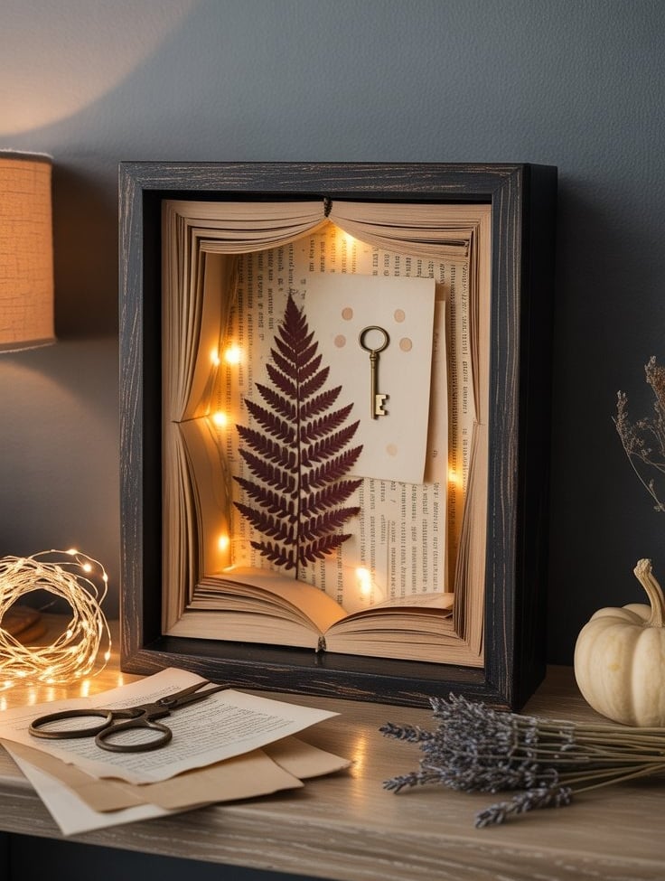Use a deep shadow box frame as your base. Layer different materials — torn paper silhouettes, pressed botanicals, lace scraps, or tiny trinkets — to build dimension. Play with depth: mount some elements on foam dots to make them pop forward. Tuck in a battery fairy light strand or a single LED candle behind the back layer for a subtle, diffused glow that makes your little scene come alive.