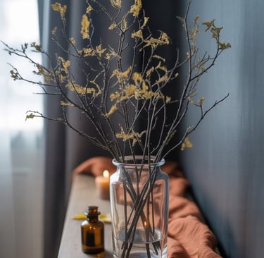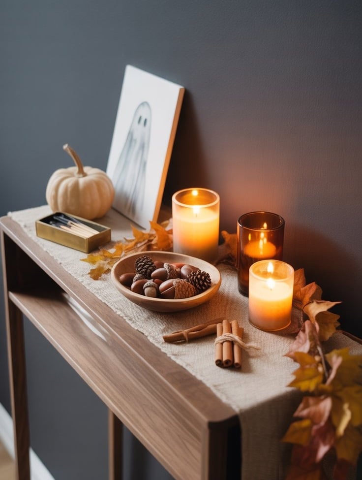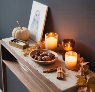 Choose a small surface — a console, side table, or floating shelf — and layer it with natural textures: linen, wood, and dried leaves. Add candles in amber glass, a bowl of acorns or pinecones, and one handmade element from your other projects (a ghost painting, a collage, or a shadow box). For a touch of scent and light, include cinnamon sticks or a pumpkin-spice candle. This is your visual meditation spot — art that breathes calm and wonder into your home.