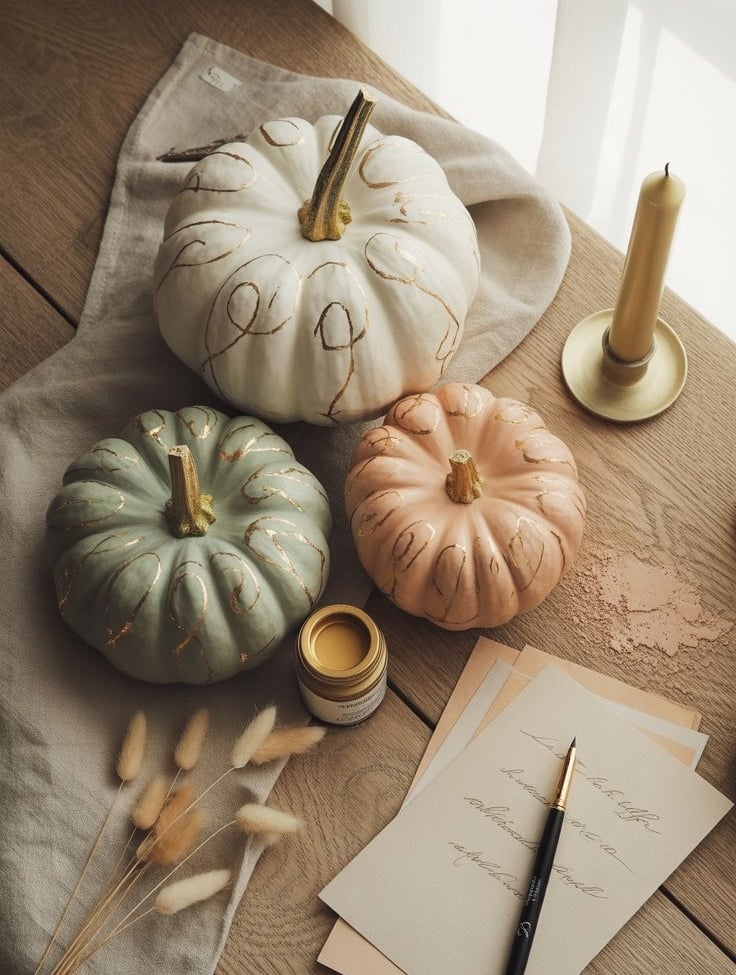 Start with small faux pumpkins or real mini gourds. Paint them with chalk paint in soft neutral shades like ivory, clay, or stone gray. Once dry, lightly brush the ridges with gold or pearl metallic acrylic for subtle highlights. If you want a personal touch, add minimal line-art faces or botanical motifs using a fine paint pen — like secret whispers only the candlelight can reveal.