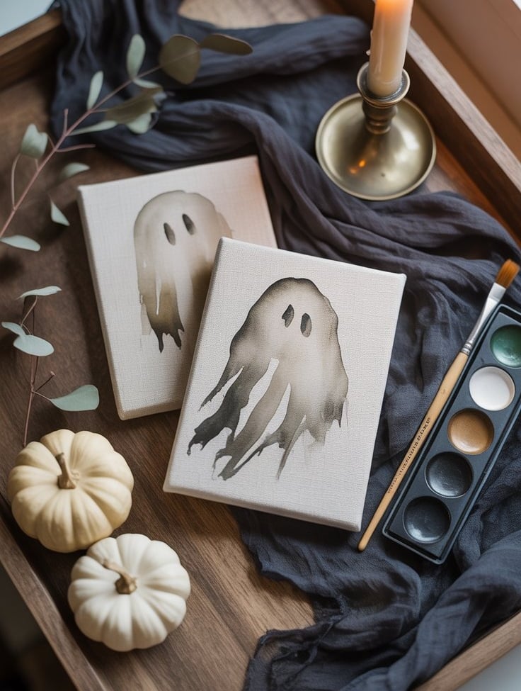 There’s something charming about the simplicity of a ghost — just soft shapes and quiet presence. This project turns that into art: minimalist, ethereal ghost figures drifting across neutral or dark-toned canvases. Think watercolor layers, sheer whites, and gentle motion. Perfect for small wall art pieces or a cozy Halloween gallery wall.