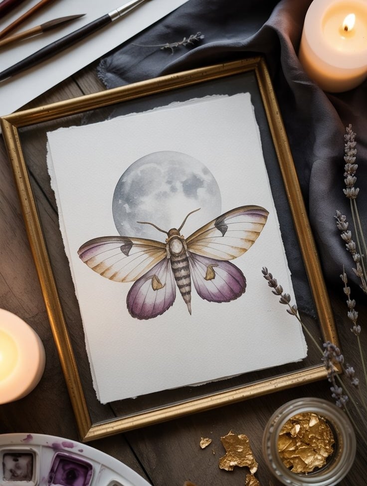 Sketch a symmetrical moth on watercolor or mixed-media paper. Paint with a muted palette — think faded lilac, pale gold, and creamy gray — then accent the wings with metallic ink or fine gold leaf details. Surround it with faint circular brushstrokes to evoke a moon glow. Frame or scan it for use as seasonal wall decor or art prints.
