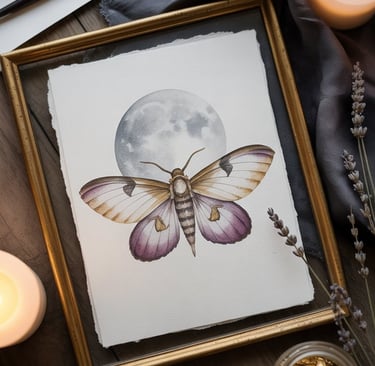 Soft, mysterious, and quietly enchanting — the moonlit moth embodies the gentler side of Halloween. This project celebrates nocturnal beauty through hand-painted or mixed-media moth illustrations bathed in moonlight tones of ivory, silver, and dusty plum. The result is an artwork that feels both spooky and serene, like a secret whispered under a full moon.