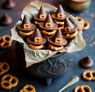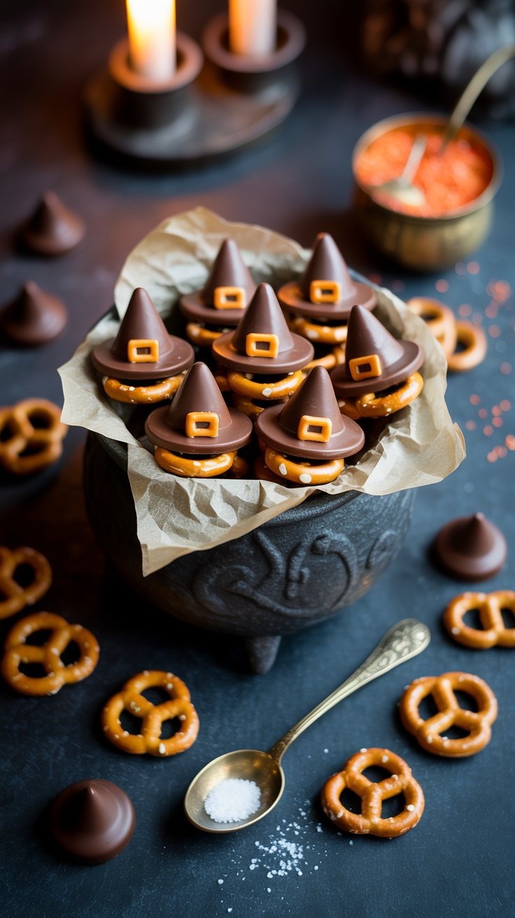 Simply place pretzel rounds on a baking tray, top each with a chocolate kiss, and warm slightly until the chocolate softens. Add an orange sprinkle or candy piece in the center. Let them cool — and voilà, the cutest little witch hats on your snack table.