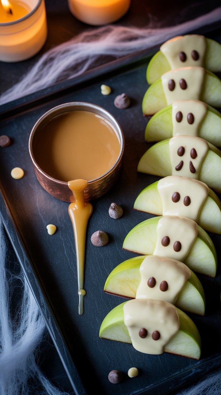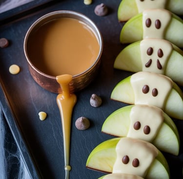For balance (and a little freshness), try Haunted Apple Slices. Dip apple wedges halfway in melted white chocolate, lay them on parchment, and use mini chocolate chips to create spooky little faces before the coating sets.