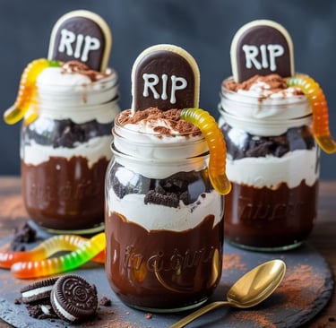 These are a guaranteed hit with all ages. Start with chocolate pudding, layer in crushed Oreos for “dirt,” and top with tombstone cookies (like Milano or graham crackers cut into shape). Add gummy worms for fun and a dollop of whipped cream for “fog.”