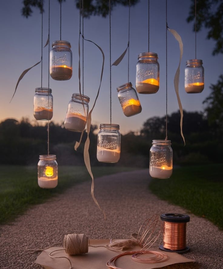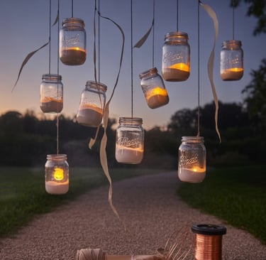 Glass jars catch the faintest flicker of candlelight, their edges fogged with breath and warmth. Inside, sand anchors the flame, while copper wire and twine let them hover — not quite touching the ground, not quite gone. They sway when the wind sighs, each one a little ghost of its own.