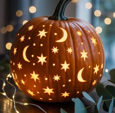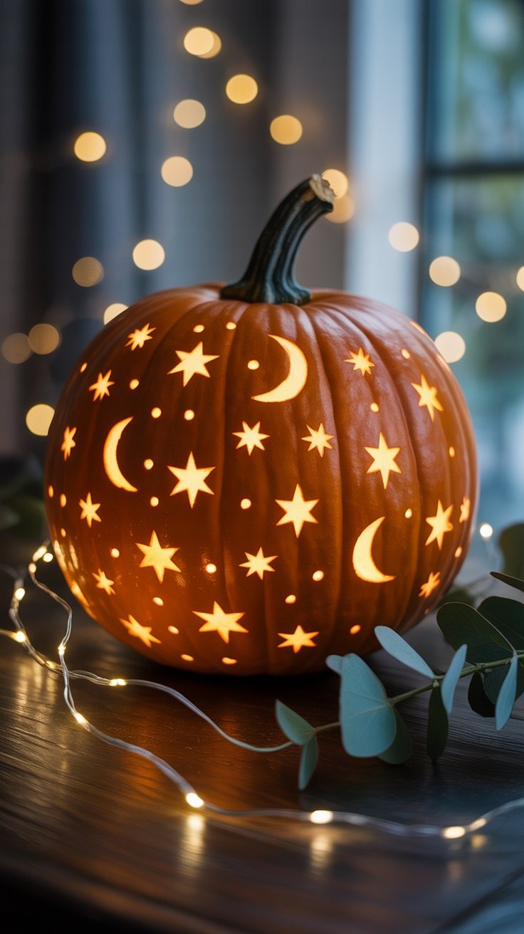 For dreamers and stargazers, carve tiny crescent moons, stars, and swirling constellations across your pumpkin. When lit, it becomes a glowing night sky — perfect for cozy corners or window sills.