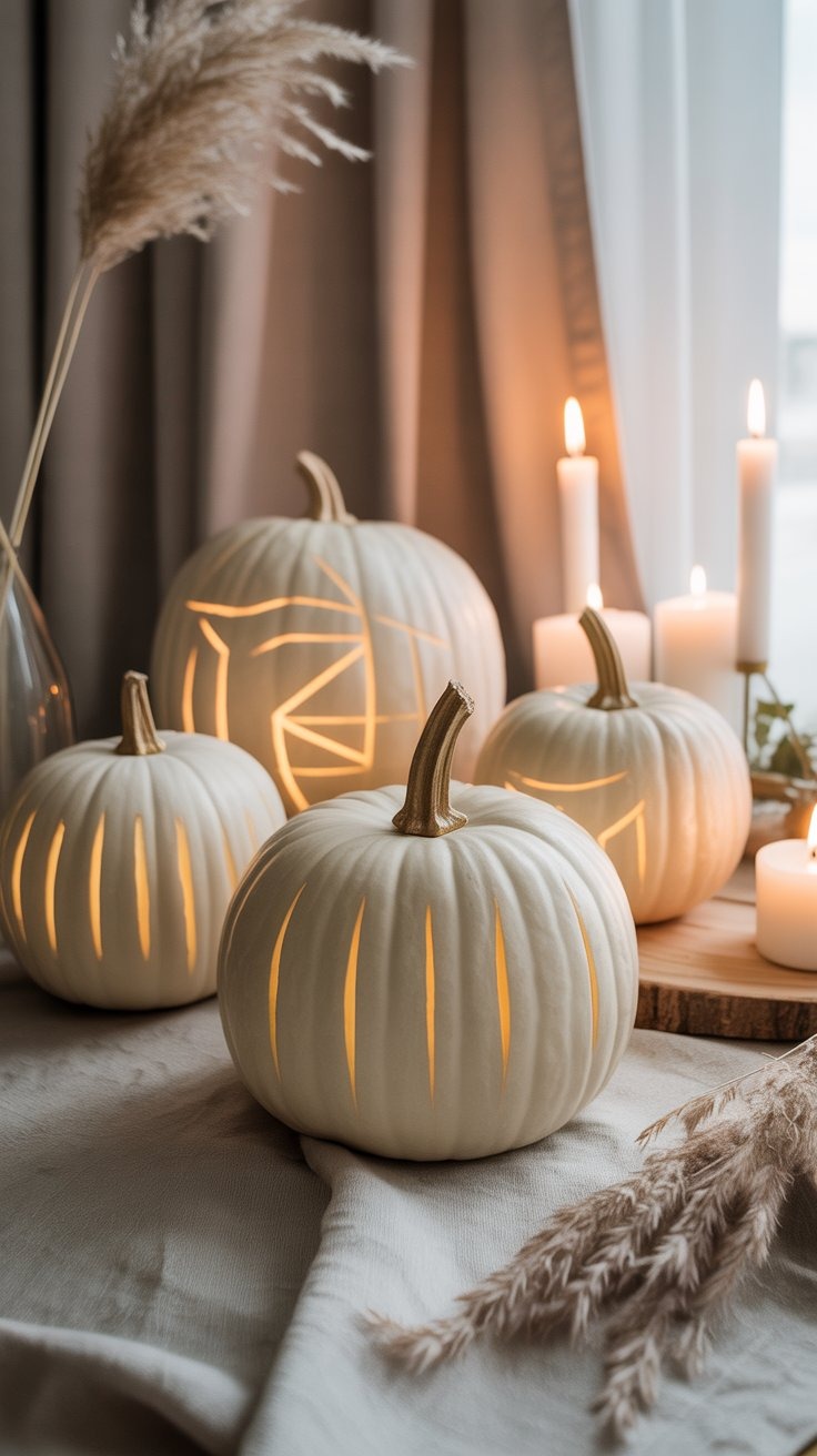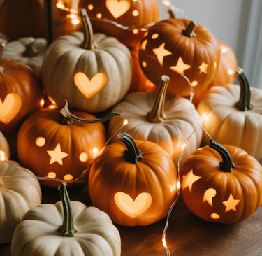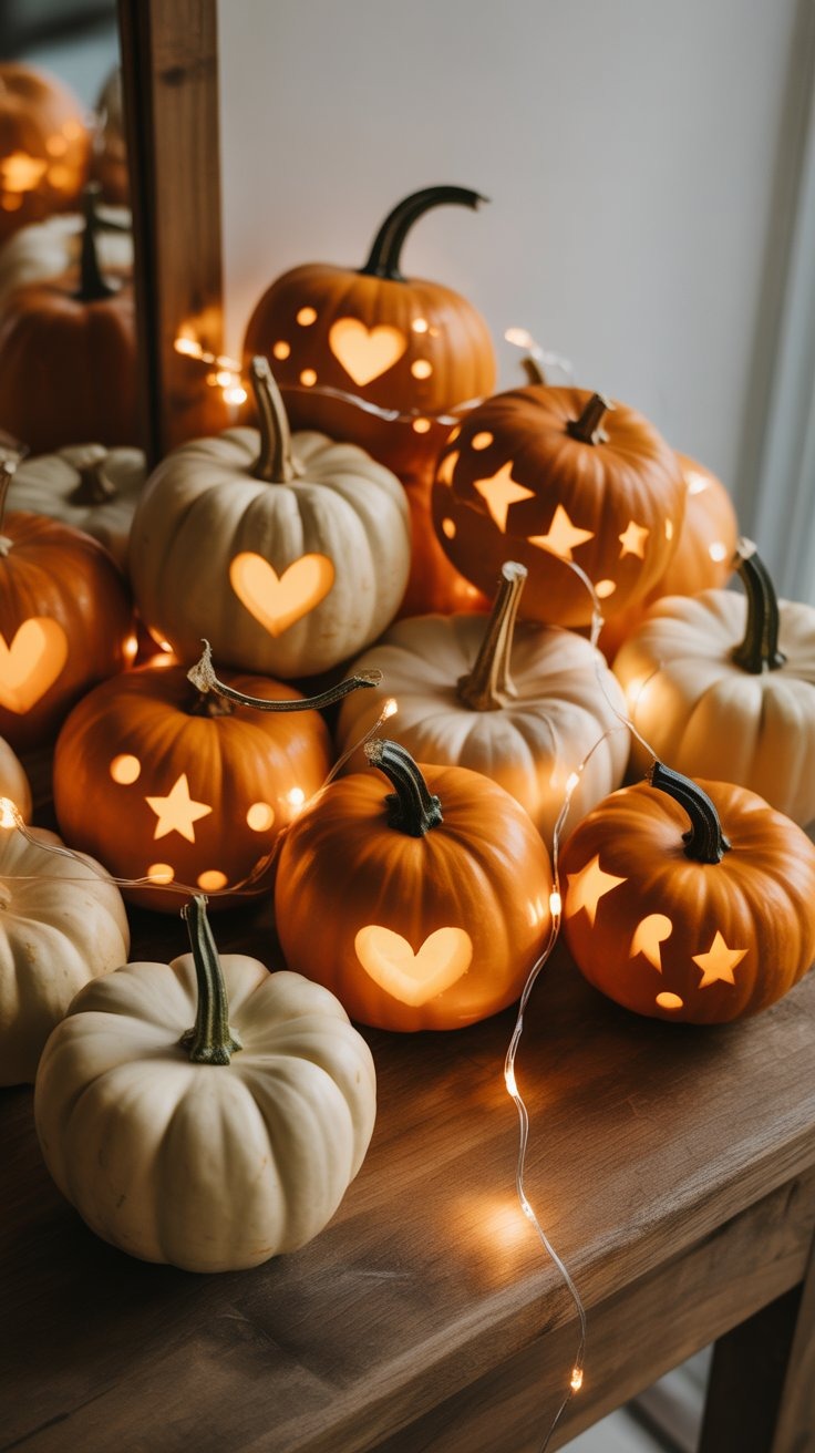 Instead of one large pumpkin, create a cluster of mini carved pumpkins — each with its own tiny design: hearts, dots, or stars. The soft glow of several together feels like a fairy gathering in your living room.