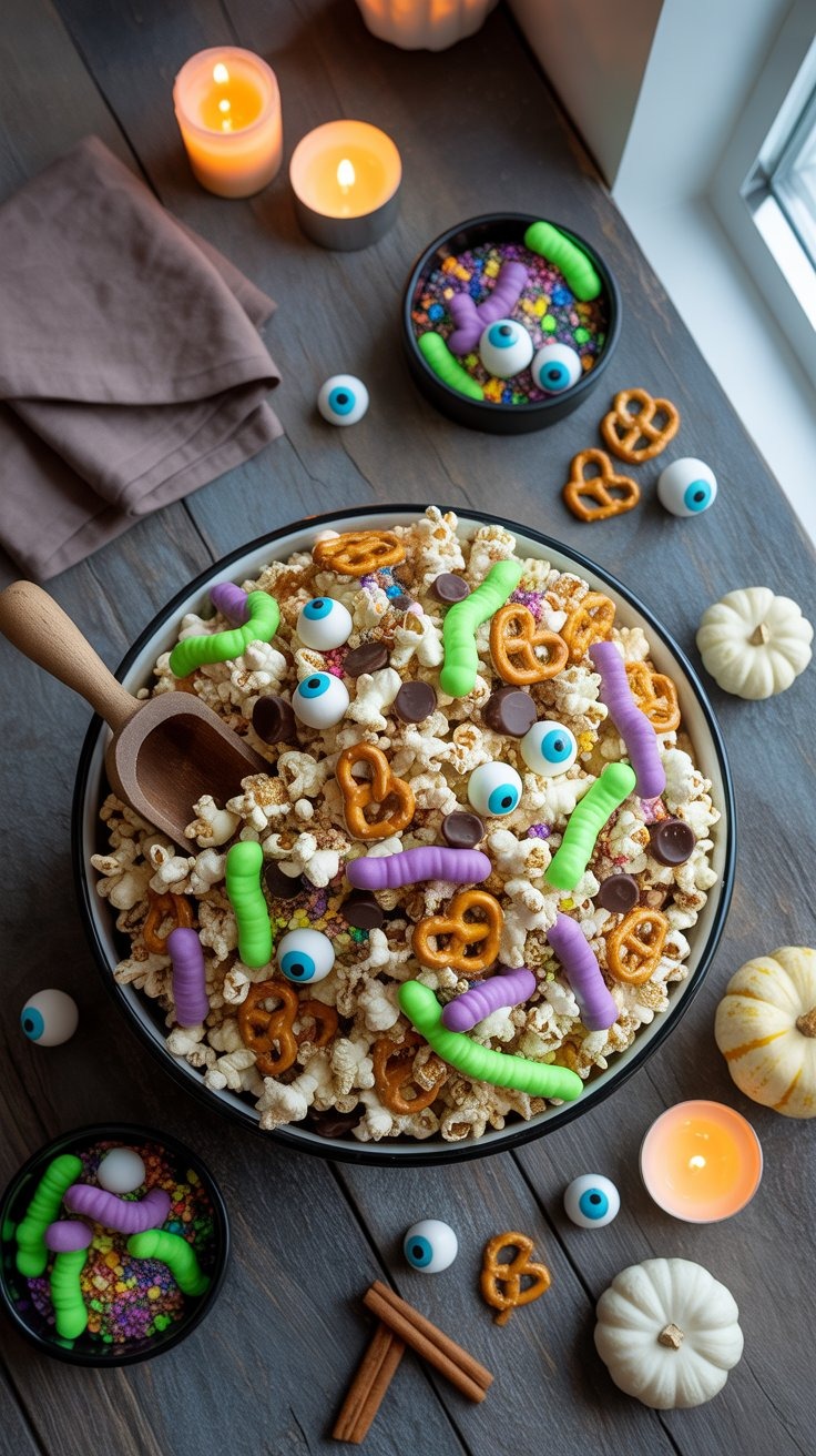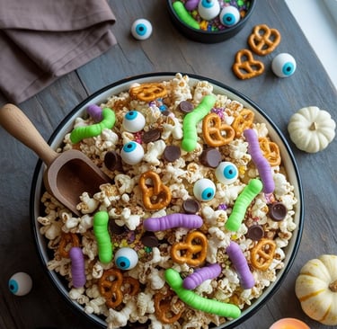 Spread the popcorn on a parchment-lined tray and drizzle it with melted white chocolate tinted in moody Halloween hues — a swirl of violet, a streak of swampy green, maybe a dash of orange for contrast. Before it sets, toss in pretzels for crunch, candy eyes for surprise, and a handful of M&M’s or candy-coated chocolates to catch the light.