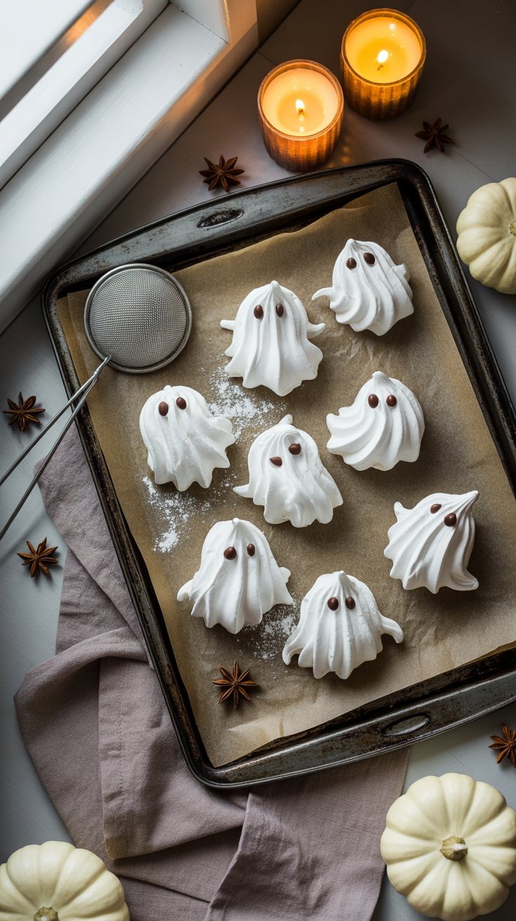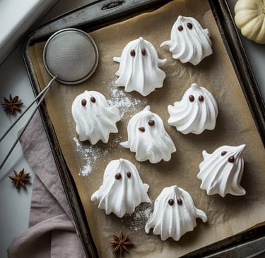 These ghostly little treats are all about simplicity and charm. Whisk egg whites until they glisten, add a whisper of vanilla, and spoon or pipe the mixture into small, playful shapes — tall for a curious ghost, short and round for a shy one. When they cool, their insides stay a touch chewy, their exteriors whisper-thin and crackling with each bite.