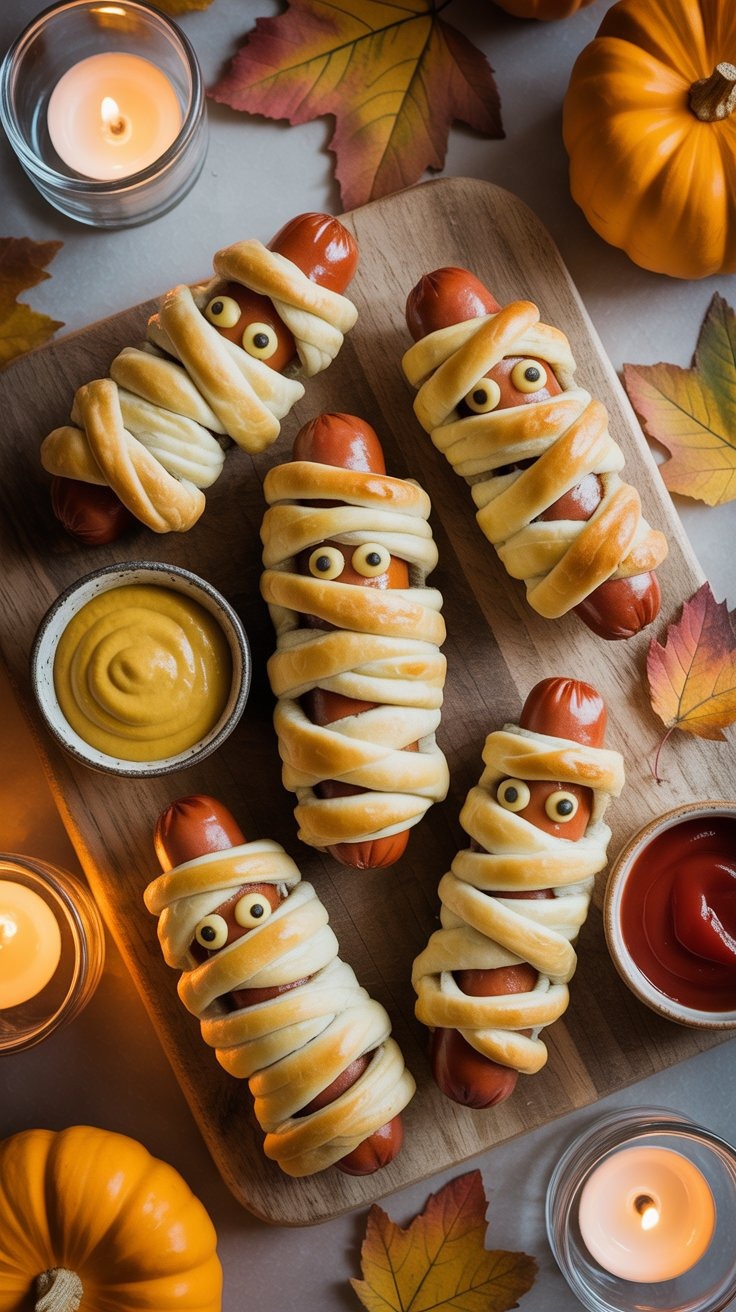 Each one starts as a mini sausage, wrapped in thin ribbons of crescent dough, leaving tiny peeks for the “eyes.” When they emerge from the oven, they glisten with warmth and color — a soft honey-gold that feels like candlelight captured in pastry. Once cooled, add two tiny dots of mustard or mayo for eyes — just enough personality to make them irresistible.