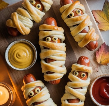 The night smells like autumn — buttery dough, roasted herbs, and a whisper of something playful in the air. In the oven, rows of little “mummies” puff and curl, their golden wraps crisping at the edges. They’re simple, nostalgic, and impossible not to smile at — comfort food with a clever Halloween disguise.